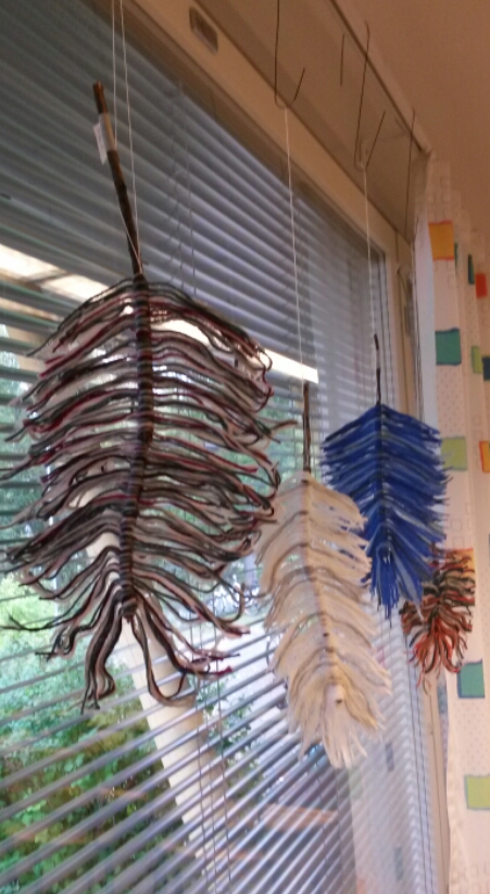 VastaaPoistaKiitoksia! Sulat ovat näyttävä,helppo ja halpa askartelu. Tein ne viidennen luokan kanssa, mutta varmasti onnistuisi pienempienkin kanssa.Työläin vaihe oli selkeästi solmiminen, koska solmuja sai tehdä aika paljon. Solmimista auttoi se, että kepit teipattiin pöytään kiinni niin, että sidottava osa oli pöydän ulkopuolella. Jotkut oppilaista pitivät työtä jalkojen välissä.